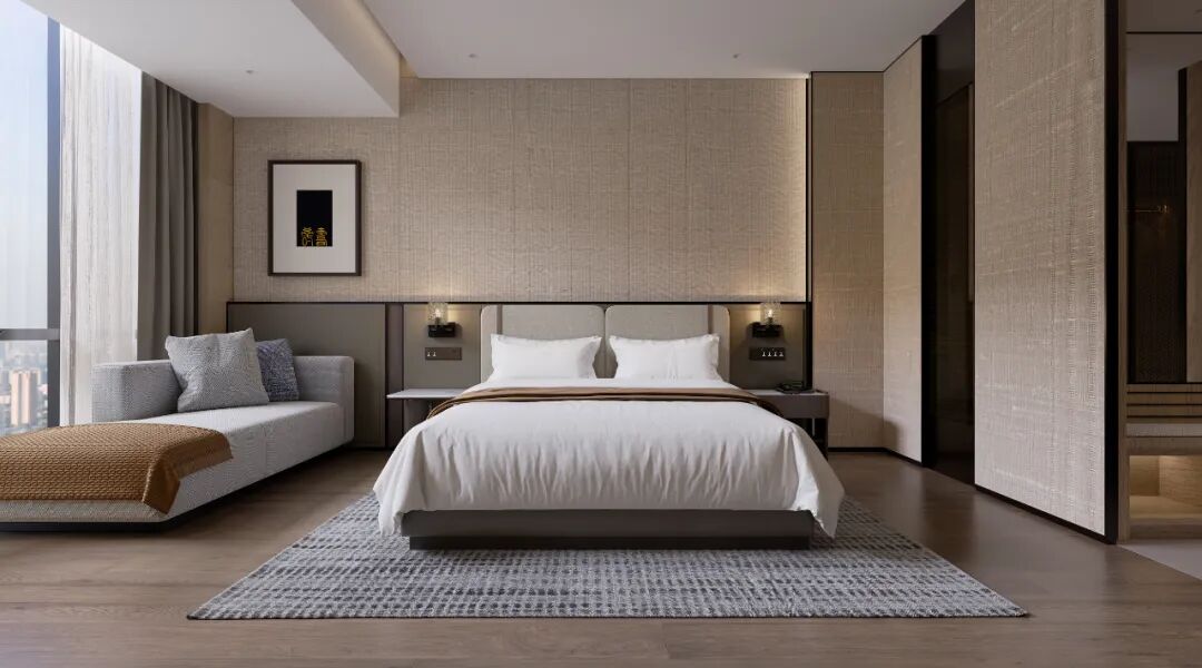 客房装修豪华典雅,设施齐全,配备冷暖空调、24小时热水、无线网络、65英寸液晶电视及智能化灯光,标准房配两张1.2米单人床,大床房与套房使用1.8米双人床,均采用新款乳胶零压床垫,舒适性高,无论短住长居,都能带来全方位舒适与宾至如归的体验。